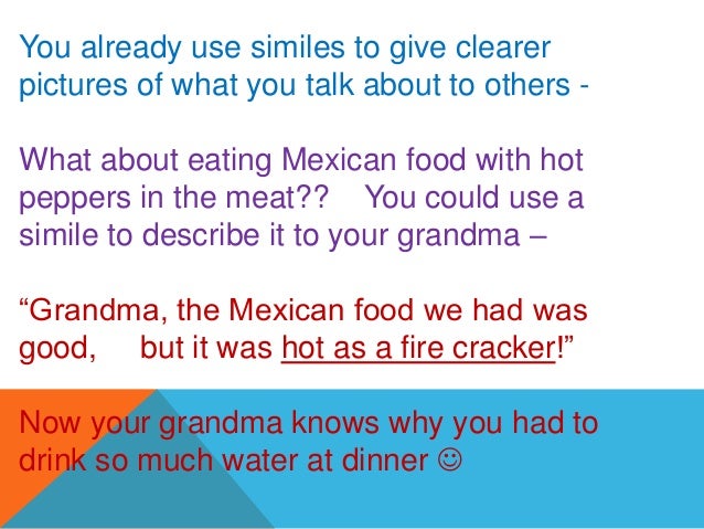 A simile is a figure of speech that compares two different things in an interesting way. Synonym a simile for hamburger would be: Similes are used in everyday conversations, written works or compositions such as poems, essays, song lyrics, plays etc. A good simile goes with good writing like two peas in a like similes can paint vivid pictures just like similes. We use similes to compare things which are alike.